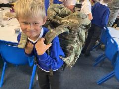 Ricky took the time to engage our young learners in discussions about the importance of remembrance, talking to them about the Service of Remembrance and parade held in Irlam every year. The children were especially excited to try on some of the Marine kit and even had a go at camouflaging themselves!